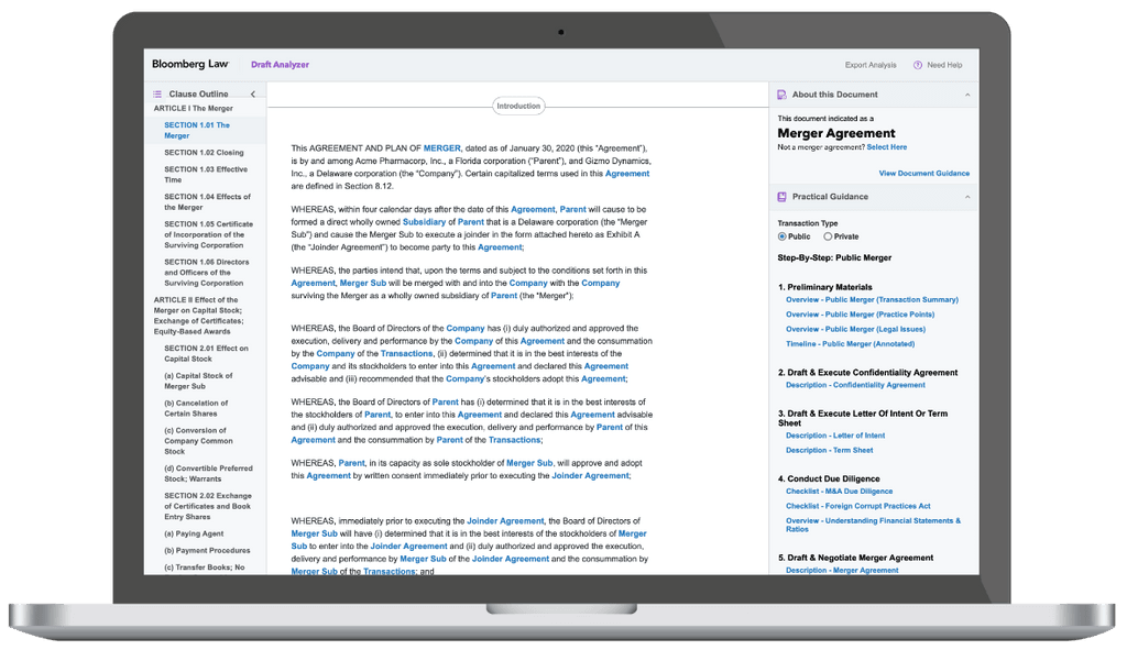Draft Analyzer uses AI and machine learning to benchmark draft language against the market standard. Our latest enhancements to this tool for M&A Purchase Agreements will reduce the time you spend on drafting and provide a high level of confidence in your finished product. Learn more about a Bloomberg Law Subscription.